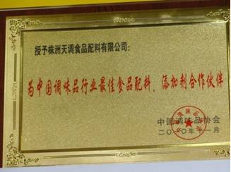 天调生物科技有限公司被中国调味品协会授予《中国调味品行业最佳食品配料合作伙伴》